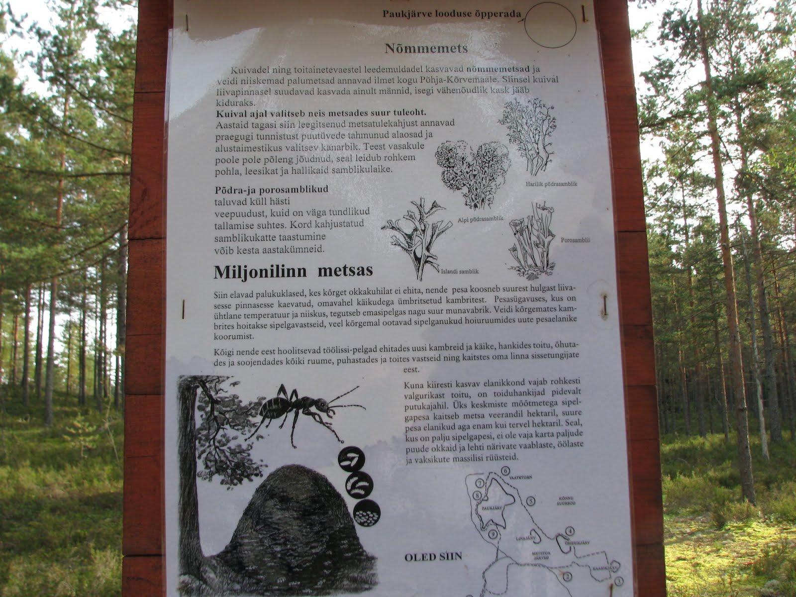 Vahepeal kaotame oma kollased mummud - märgid silmist. Siis jälle leiame. Päris karm, kui satuks hoopis saja kilomeetri rajale. Vastu tuleb suure kotiga ehtne matkamees. Teretame nagu külas kombeks.Ninad on nii seentes kui kõrgemal. Rada nõuab mäkkerühkimist. Tundub, et hakkame kohale saama.